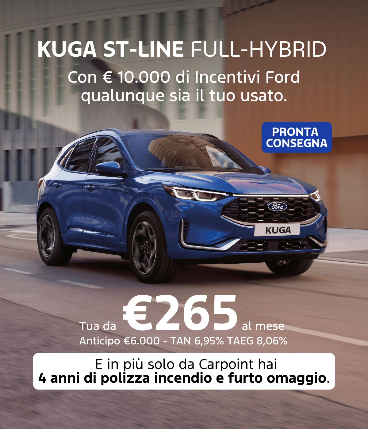 Promozione valida fino al 28/02/2026 su Nuova Kuga ST-Line 2.5 Benzina - Full Hybrid 180CV 2WD MY2026.25 a € 31.250. A fronte di permuta o rottamazione di un veicolo con almeno 6 mesi di proprietà alla data di immatricolazione del nuovo veicolo. Grazie al contributo dei Ford Partner che aderiscono all’iniziativa. Prezzo raccomandato da Ford Italia S.p.A. IPT e contributo per lo smaltimento pneumatici esclusi. Immagini a titolo puramente illustrativo, possono contenere accessori a pagamento. Messaggio pubblicitario con finalità promozionale. Nuova Ford Kuga: ciclo misto WLTP consumi da 0,9 a 7,2 litri/100km, emissioni CO₂ da 20 a 163 g/km. Esempio di finanziamento IdeaFord a € 31.250. Anticipo € 6.000, 48 quote da € 265,11 escluse spese incasso rata € 5, più quota finale (VFG) di € 19.320, Importo totale del credito € 25.640. Totale da rimborsare € 32.349,38. Spese gestione pratica € 390. Imposta di bollo in misura di legge all'interno della prima quota mensile. TAN FISSO 6,95%, TAEG 8,06%. Salvo approvazione Ford Credit Italia Spa. Km totali 30.000. Costo esubero 0,20€/km. Documentazione precontrattuale in concessionaria. Per condizioni e termini della promozione finanziaria e delle coperture assicurative fare riferimento alla brochure informativa disponibile presso il Ford Partner o sul sito www.fordcredit.it.