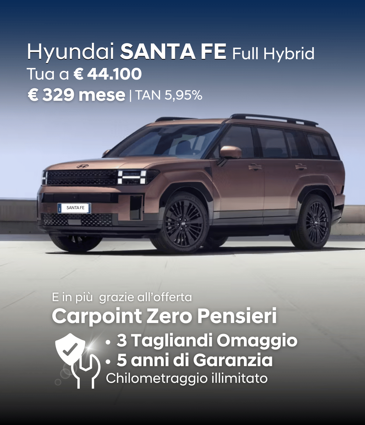 Annuncio promozionale. Gamma SANTA FE HEV MY25: consumi l/100 km (ciclo medio combinato WLTP correlato) da 6,402 a 7,328. Emissioni CO2 g/km da 145,40 a 166,40 secondo gli ultimi dati omologativi disponibili. In ogni caso, per i valori di emissioni fa fede il COC. Offerta valida con finanziamento Hyundai Plus fino al 28/02/2026 presso le Concessionarie aderenti per un vantaggio totale cliente di €6.500 così composto: €3.500 Hyundai Promo, €1.500 con permuta o rottamazione e €1.500 Hyundai Promo TCM. Esempio di finanziamento SANTA FE MY25 1.6 T-GDi HEV 2WD Business, Prezzo di Listino € 50.600, IPT e PFU esclusi, prezzo promo valido a fronte della sottoscrizione del finanziamento ''Hyundai Plus'' € 44.100, anziché € 45.600 (prezzo promo senza finanziamento). Anticipo (o eventuale permuta) € 9.400; importo totale del credito € 34.700; rata finale pari al Valore Garantito Futuro di € 29.348,00 (se il cliente decide di tenere il veicolo); importo totale dovuto dal consumatore (escluso l'Anticipo) € 41.080,48 da restituire in 35 rate mensili ognuna di € 328,59 (oltre la rata finale). TAN 5,95% (tasso fisso) - TAEG 6,86% (tasso fisso). Spese comprese nel costo totale del credito: interessi € 5.753,35, istruttoria € 395, incasso rata € 3,90 cad. a mezzo SDD, produzione e invio lettera conferma contratto € 1.00; comunicazione periodica annuale € 1,00 cad.; imposta sostitutiva: € 87,74; max. km totali 45.000; costo esubero km pari a 0,10€/km in caso di restituzione/sostituzione del veicolo. Condizioni contrattuali ed economiche nelle ''Informazioni europee di base sul credito ai consumatori'' presso i concessionari e sul sito https://www.hyundaicapitalitaly.com/trasparenza da leggere prima della sottoscrizione delle stesse. Salvo approvazione di Hyundai Capital Bank Europe. L’ultimo prezzo promozionale della medesima versione nei 30 giorni precedenti all’inizio del presente annuncio pubblicitario era di €44.600 (in caso di finanziamento Hyundai Plus) e di €45.600 (senza finanziamento).