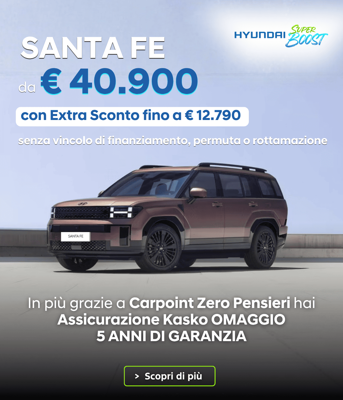 La Hyundai Santa Fe è un SUV sofisticato e versatile, disponibile in configurazioni da 5 o 7 posti. È pensato per chi vive la città ma anche per chi non rinuncia all’avventura. La Hyundai Santa Fe è il SUV che accompagna la tua famiglia ovunque, con particolare attenzione a comfort, sicurezza e connettività.