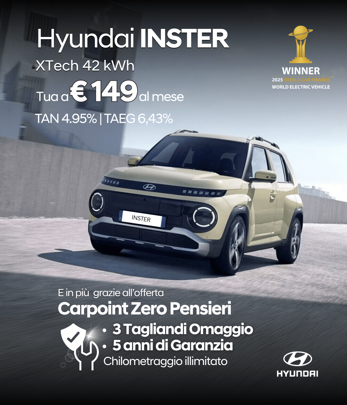Annuncio promozionale. Gamma INSTER: (ciclo medio combinato WLTP correlato) consumi da 143 Wh/km a 151 Wh/km. Emissioni CO2 g/km 0,0 secondo gli ultimi dati omologativi disponibili. In ogni caso, per i valori di emissioni fa fede il COC. Offerta valida con finanziamento Hyundai Plus fino al 28/02/2026 presso le Concessionarie aderenti per un vantaggio totale cliente di €3.000 così composto: €1.500 Hyundai Promo e €1.500 Hyundai Promo TCM. L’offerta include il cavo di ricarica trifase da 5 metri con capacità massima 22 kW e sacca portacavo. Esempio di finanziamento INSTER XTech 49 kWh, Prezzo di Listino € 26.650, IPT e PFU esclusi, prezzo promo valido a fronte della sottoscrizione del finanziamento ''Hyundai Plus'' € 23.650, anziché € 25.150 (prezzo promo senza finanziamento). Anticipo (o eventuale permuta) € 6.570; importo totale del credito € 17.080; rata finale pari al Valore Garantito Futuro di € 14.657,50 (se il cliente decide di tenere il veicolo); importo totale dovuto dal consumatore (escluso l'Anticipo) € 20.049,44 da restituire in 35 rate mensili ognuna di € 148,69 (oltre la rata finale). TAN 4,95% (tasso fisso) - TAEG 6,43% (tasso fisso). Spese comprese nel costo totale del credito: interessi € 2.386,35, istruttoria € 395, incasso rata € 3,90 cad. a mezzo SDD, produzione e invio lettera conferma contratto € 1.00; comunicazione periodica annuale € 1,00 cad.; imposta sostitutiva: € 43,69; max. km totali 15.000; costo esubero km pari a 0,10€/km in caso di restituzione/sostituzione del veicolo. Condizioni contrattuali ed economiche nelle ''Informazioni europee di base sul credito ai consumatori'' presso i concessionari e sul sito https://www.hyundaicapitalitaly.com/trasparenza da leggere prima della sottoscrizione delle stesse. Salvo approvazione di Hyundai Capital Bank Europe. L’ultimo prezzo promozionale della medesima versione nei 30 giorni precedenti all’inizio del presente annuncio pubblicitario era di €24.150, (in caso di finanziamento Hyundai Plus) e di €24.650 (senza finanziamento).