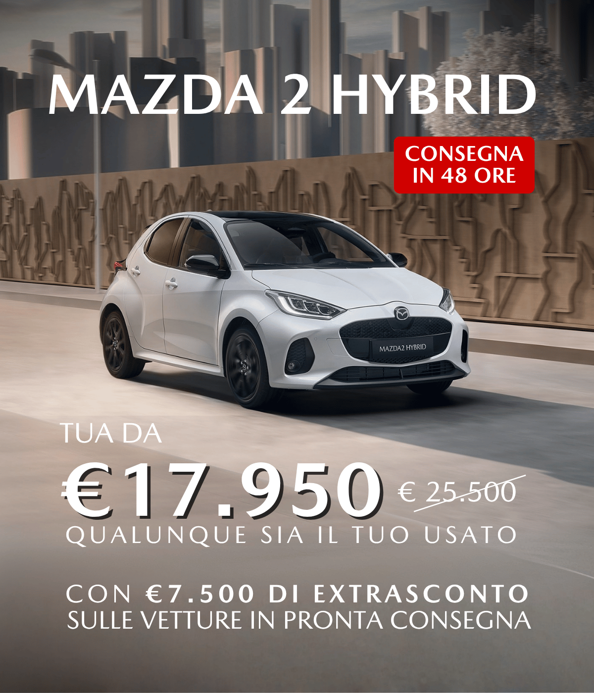 ** Annuncio promozionale. MAZDA2 HYBRID PRIME LINE Prezzo di listino €24.990. Esempio di finanziamento. Offerta valida solo con finanziamento Mazda Advantage e in caso di permuta: Prezzo promo € 19.500,00, anticipo € 4.860,00; importo totale del credito € 14.640,00, da restituire in 36 rate mensili ognuna di € 148,80, ed un VFG pari alla maxi rata finale di € 11.745,30, importo totale dovuto dal consumatore € 17.311,19. TAN 4,99% (tasso fisso) - TAEG 6,76% (tasso fisso). Spese comprese nel costo totale del credito: interessi € 2.063,10, istruttoria € 399,00, incasso rata € 4,50 cad. a mezzoSDD, produzione e invio lettera conferma contratto € 1.00; comunicazione periodica annuale € 1,00 cad.; imposta sostitutiva (o imposta di bollo): € 37,59. Offerta valida presso i dealers aderenti, fino al 30/06/2026. Condizioni contrattuali ed economiche in "Informazioni Europee di Base sul Credito ai Consumatori" presso la rete di vendita e sul sito www.santanderconsumer.it, sez. Trasparenza. Salvo approvazione di Santander Consumer Bank.