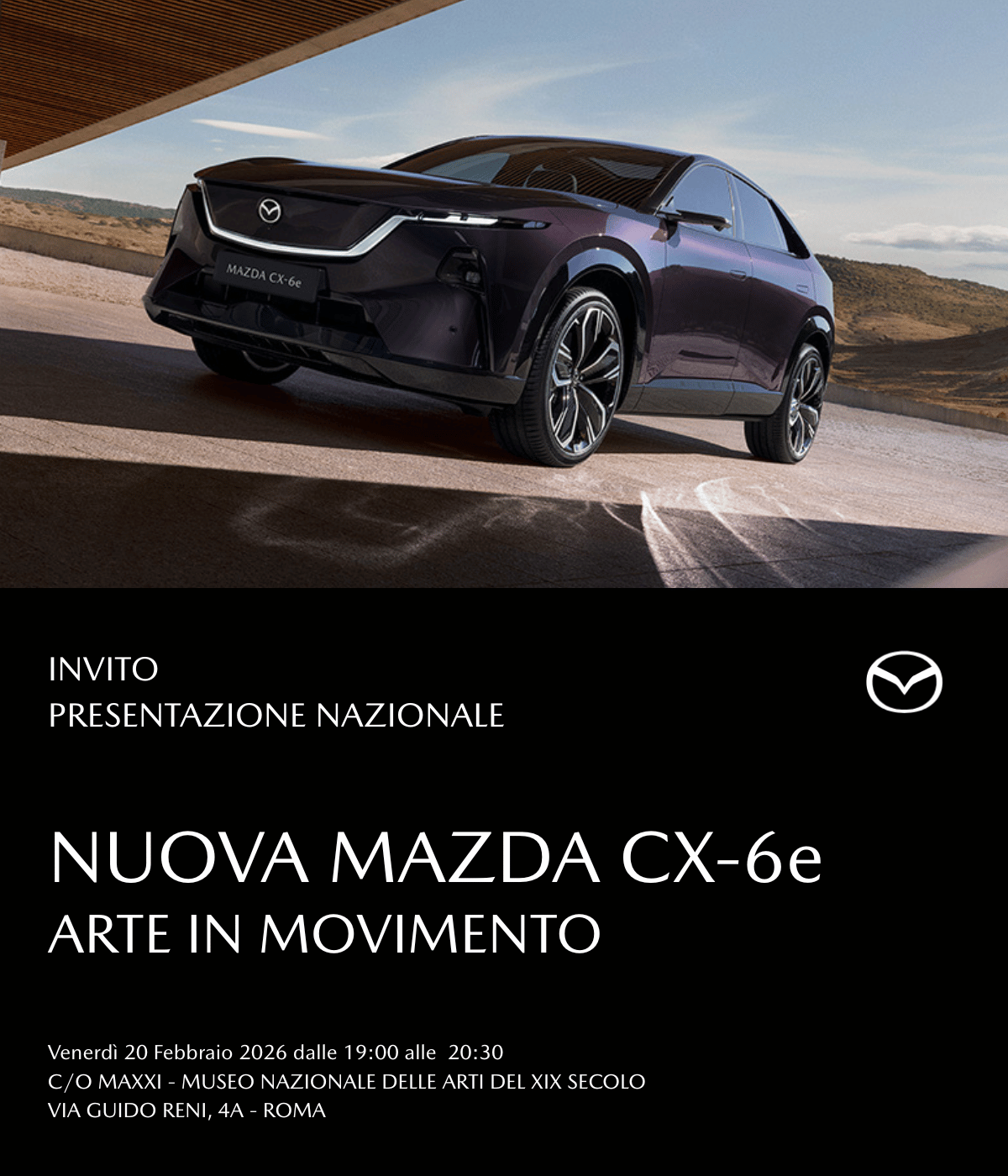 Siamo lieti di invitarti alla PRESENTAZIONE NAZIONALE DELLA NUOVA MAZDA CX-6e, il nuovo SUV 100% elettrico, che sarà protagonista di un’anteprima esclusiva al MAXXI, Museo Nazionale delle Arti del XIX Secolo.
