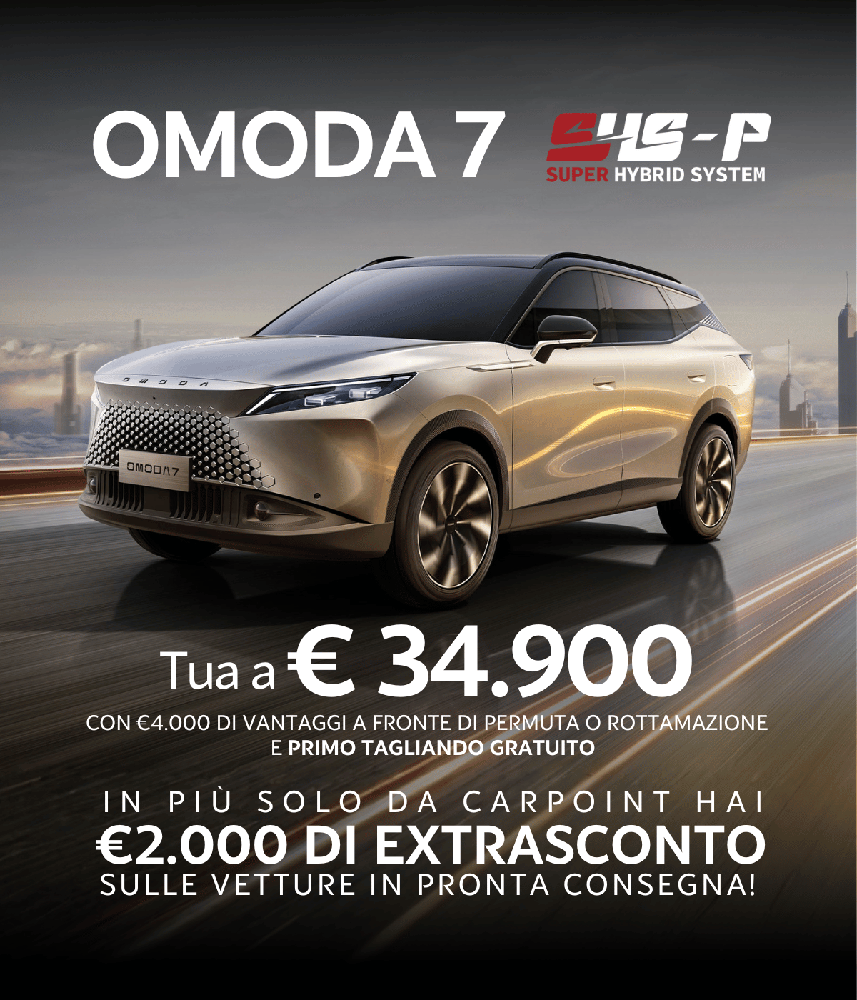 Es. di finanziamento su Omoda 7 SHS-P PURE – Prezzo Listino (messa su strada, IPT e contributo PFU esc.) 38.210€. Prezzo Promo 34.900€, in caso di permuta o rottamazione di un veicolo usato ed esclusivamente per dealer aderenti all’iniziativa. Anticipo 9.370 €, durata 36 mesi, 35 rate mensili di 259€ (incluse spese incasso di 4,50€/rata). Maxi Rata 22.162 €. Importo Totale del Credito 26.021€ (spese istruttoria 475€, bollo 16€). Spese invio rendiconto periodico digitale: 2€/anno. Interessi totali 5.023€. Importo Totale Dovuto (escluso anticipo) 31.707€. TAN fisso 6,95% – TAEG 8,24%.