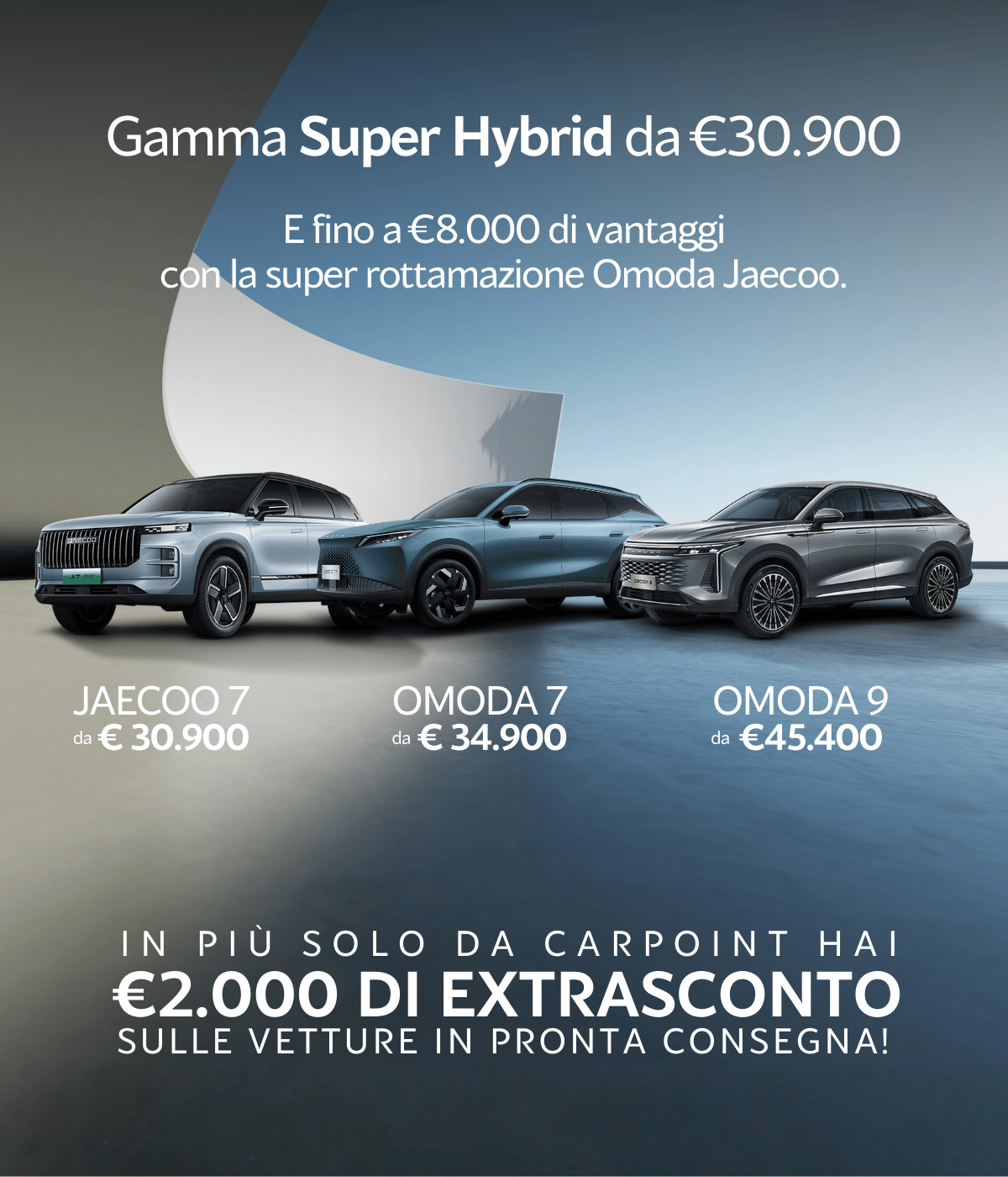 Es. di finanziamento su Jaecoo 7 Superhybrid Select – Prezzo Listino (messa su strada, IPT e contributo PFU esc.) 38.210€. Prezzo Promo 30.900€, solo in caso di rottamazione di un veicolo usato ed esclusivamente per dealer aderenti all’iniziativa. Anticipo 8.230€, durata 36 mesi, 35 rate mensili di 199€ (incluse spese incasso di 4,50€/rata). Maxi Rata 19.866€. Importo Totale del Credito 23.561€ (incluso servizio StarIdentity € 400 polizza obbligatoria per ottenere le condizioni contrattuali offerte, spese istruttoria 475€, bollo 16€). Spese invio rendiconto periodico digitale: 2€/anno. Interessi totali 3.095€. Importo Totale Dovuto (escluso anticipo) 27.310€. TAN fisso 4,75% – TAEG 6,70%.