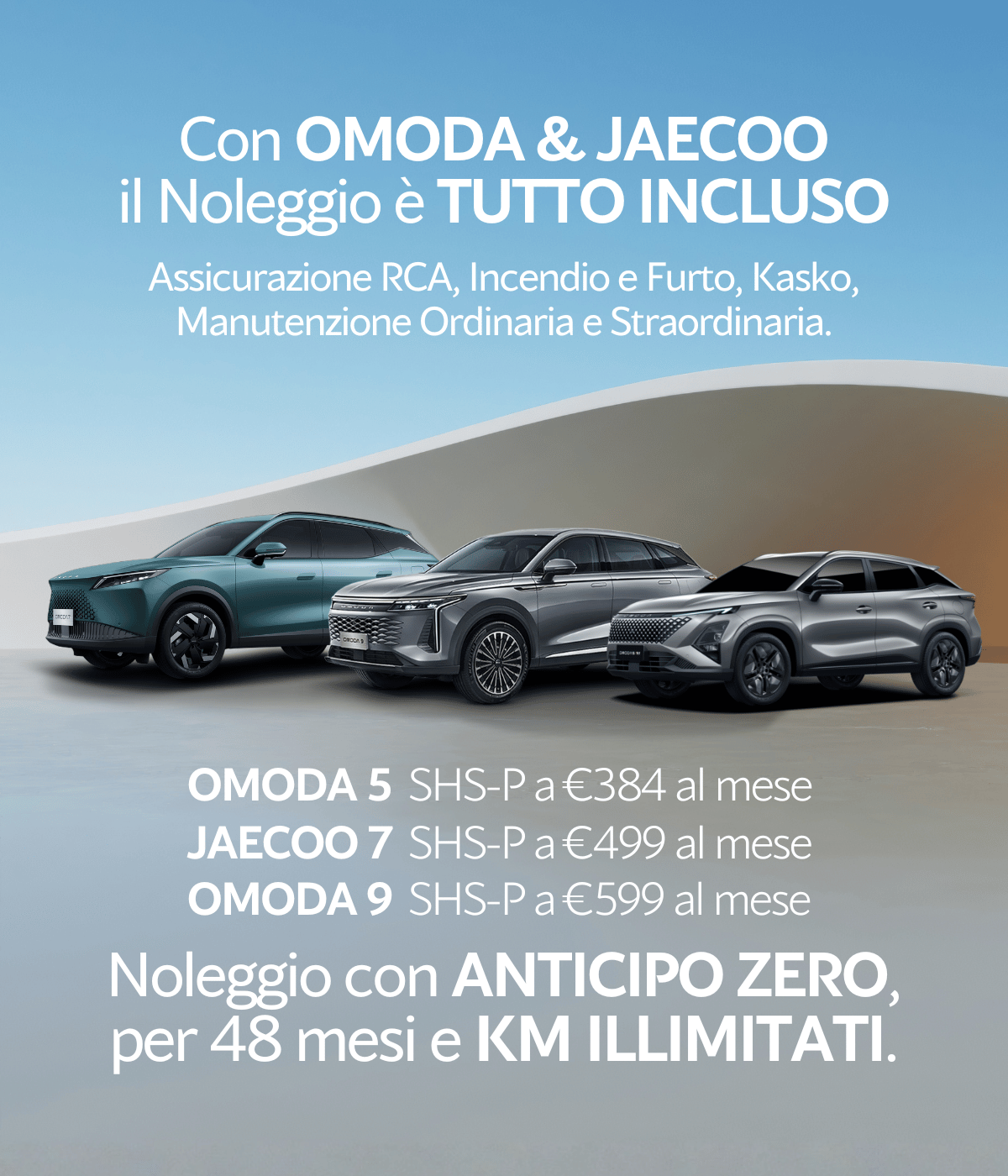 Scopri un nuovo modo di vivere la mobilità con Omoda Jaecoo Mobility: la libertà di guidare i modelli più all’avanguardia attraverso un noleggio a lungo termine che ti mette al volante senza pensieri. Con un canone mensile trasparente e inclusivo, tutti i principali costi di gestione sono integrati, dalla manutenzione al bollo, dall’assicurazione all’assistenza stradale, così puoi concentrarti solo sul piacere della guida. La flessibilità della durata contrattuale, la possibilità di scegliere chilometraggio adeguato alle tue esigenze e la garanzia di un veicolo sempre aggiornato ti offrono una vera soluzione “chiavi in mano” per una mobilità moderna, sostenibile e completamente su misura.