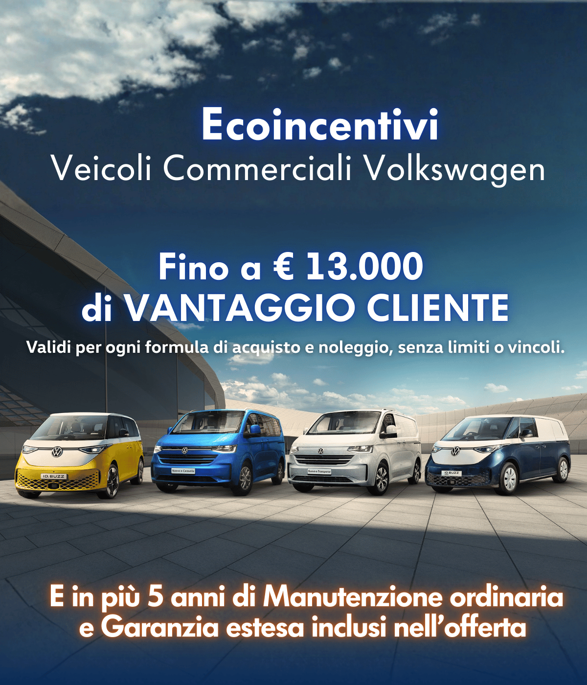 Approfitta degli ecoincentivi Volkswagen Veicoli Commerciali. Fino a € 13.000 euro di incentivi per l’acquisto di un veicolo elettrico della gamma.